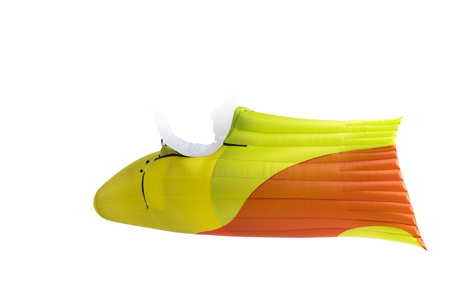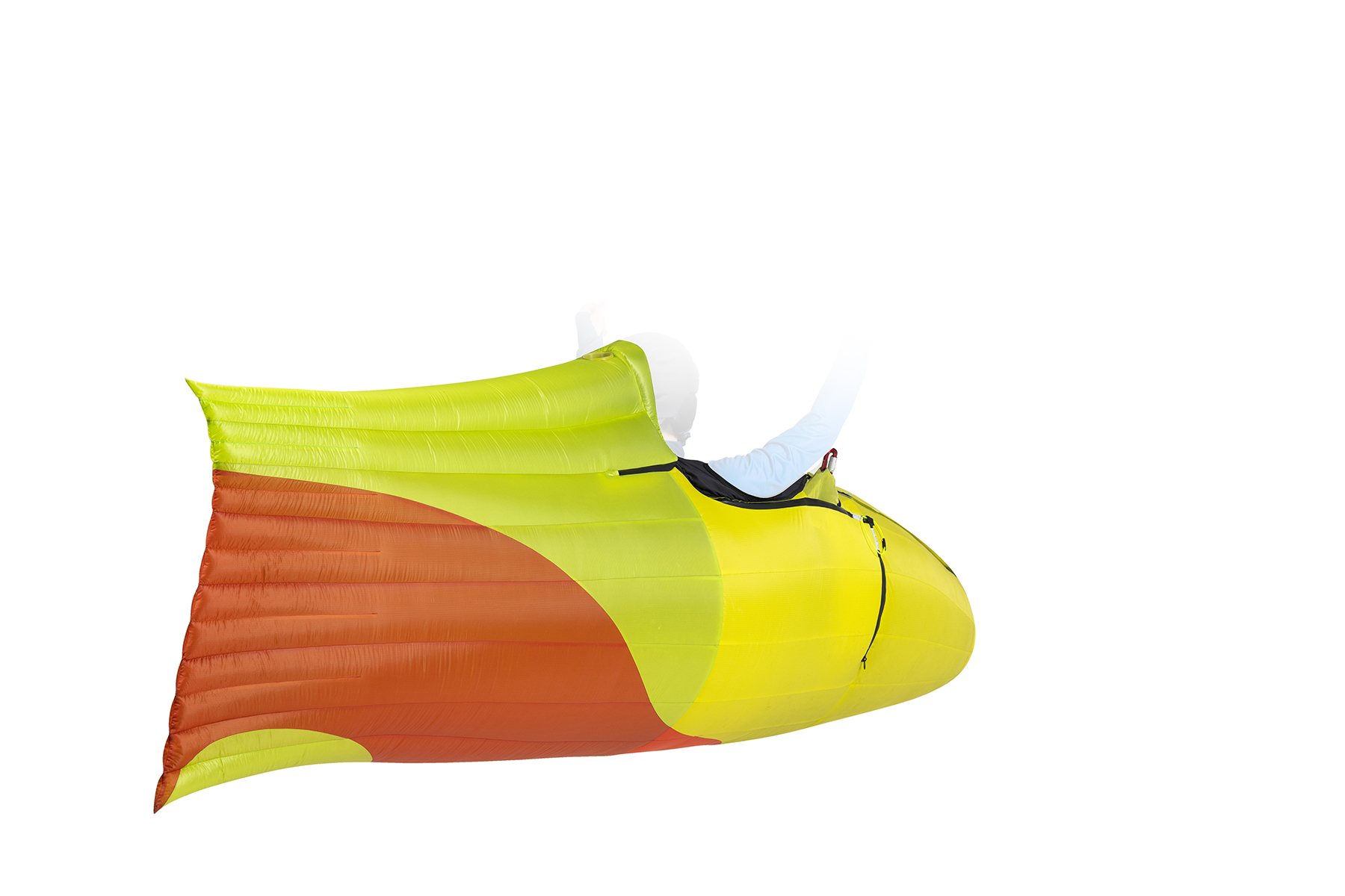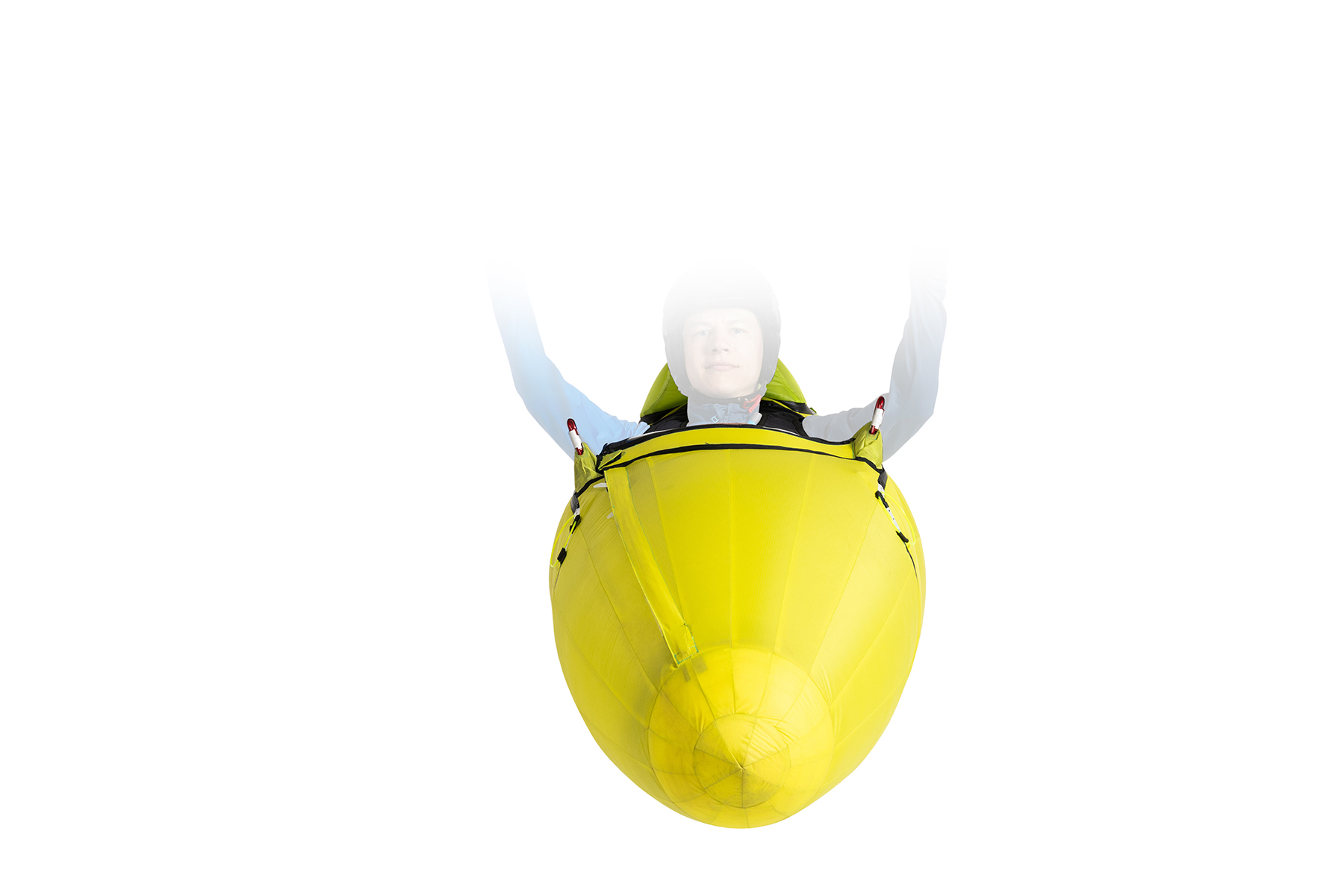 コクーンの開閉はマグネットファスナーを採用しています。脚を曲げることで、パイロットは1-2秒でレッグカバーを開き、手の助けを借りずに脚を突き出すことができます。また、脚をレッグカバーの中に簡単に収めることができ、マグネットファスナーは自動的に閉じ、レッグカバーの中の陽圧を保ちます。パイロットは瞬時に脚を伸ばし、1メートルの高さからでも(従来のレッグカバーハーネス同様に)着地することができます。この機能は着水してしまったときに脚をすぐに出して安全な体制でレスキューを待つこともでき、脚にピー(排尿)チューブを取り付けることや、フライト中に軽く足でレッグカバーを開けて換気するなども可能になります。パイロットが完全に失速したときでもテール内の圧力を瞬時に下げることも可能になり、想定される様々なトラブルも解決されます。パイロットは脚を曲げるだけで、瞬間的にマグネットファスナーによりレッグカバーを開けることができます。するとハーネス内の圧力を瞬時に下げることができ、テールは硬さと形状を失います。従って、テールは翼のラインが引っかかってしまうなど、翼の回復を妨げることが起こりません。通常のフライトに瞬時に戻ることができ、その後、脚を伸ばすだけで、レッグカバーは自動的に閉じ、ハーネスの形状はすぐに膨らみ元に戻ります。このように、パイロットは状況に応じてテール内部の圧力を調整することができます。