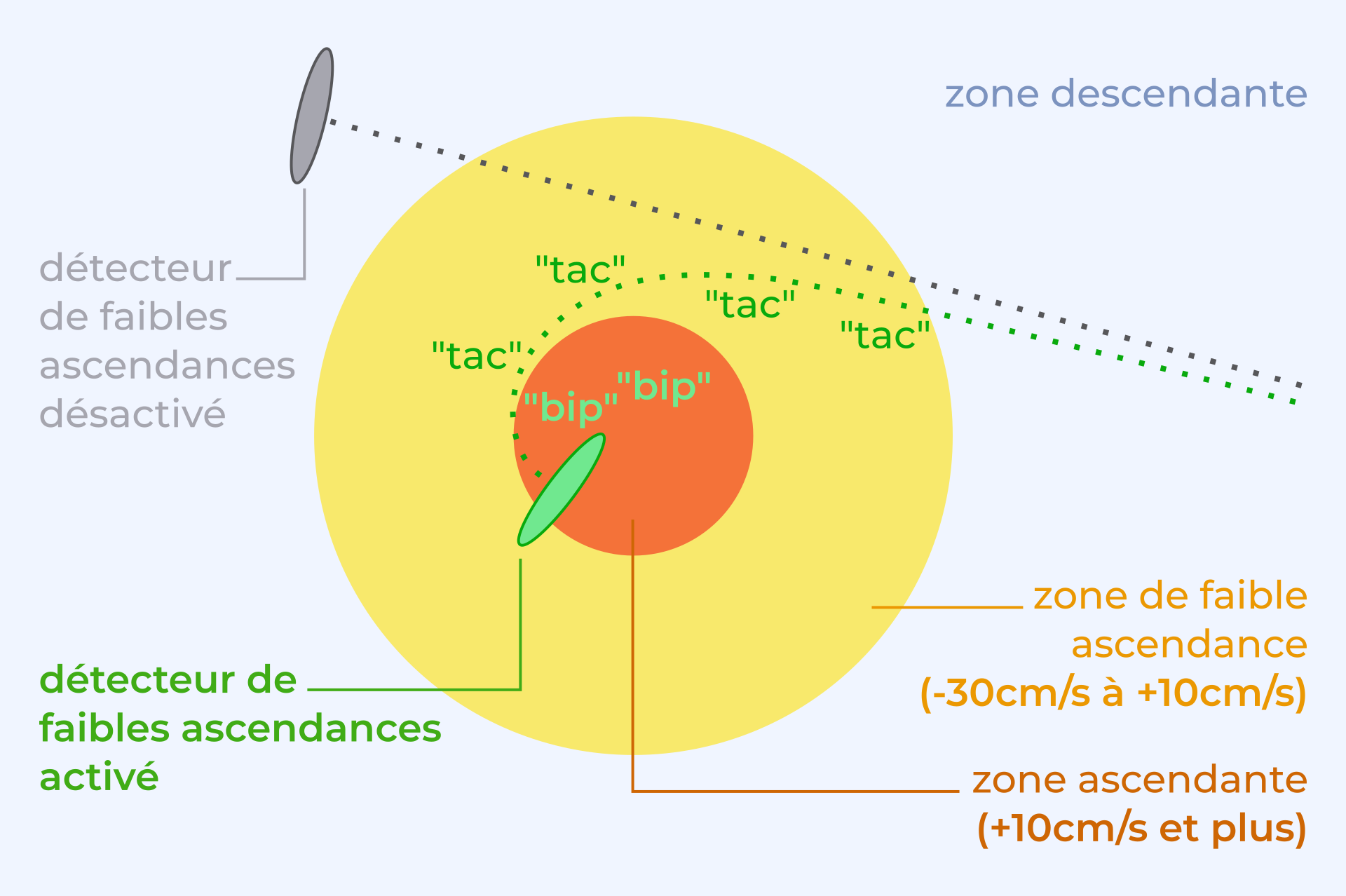 ビップビップPro V2の低揚力探知機の音は、低揚力を示す短い変調で構成されています。(-30cm/sから+10cm/s)ロールアップするほど強くはありませんが、最も近いサーマルを見つけるのに役立ちます。